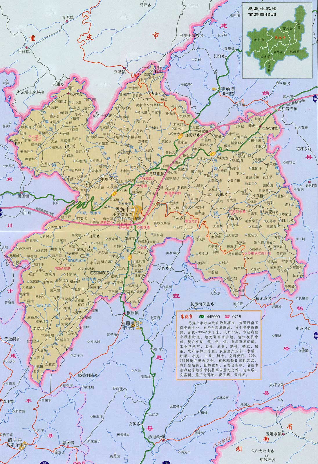 恩施土家族苗族自治州(簡(jiǎn)稱(chēng)恩施州)位于湖北省西南部,東連荊楚,南接瀟湘,西臨渝黔,北靠神農(nóng)架,國(guó)土面積2.4萬(wàn)平方公里,轄恩施、利川兩市和建始、巴東、宣恩、來(lái)鳳、咸豐、鶴峰六縣。恩施州于1983年8月19日建州,是共和國(guó)最年輕的自治州,也是湖北省唯一的少數(shù)民族自治州。